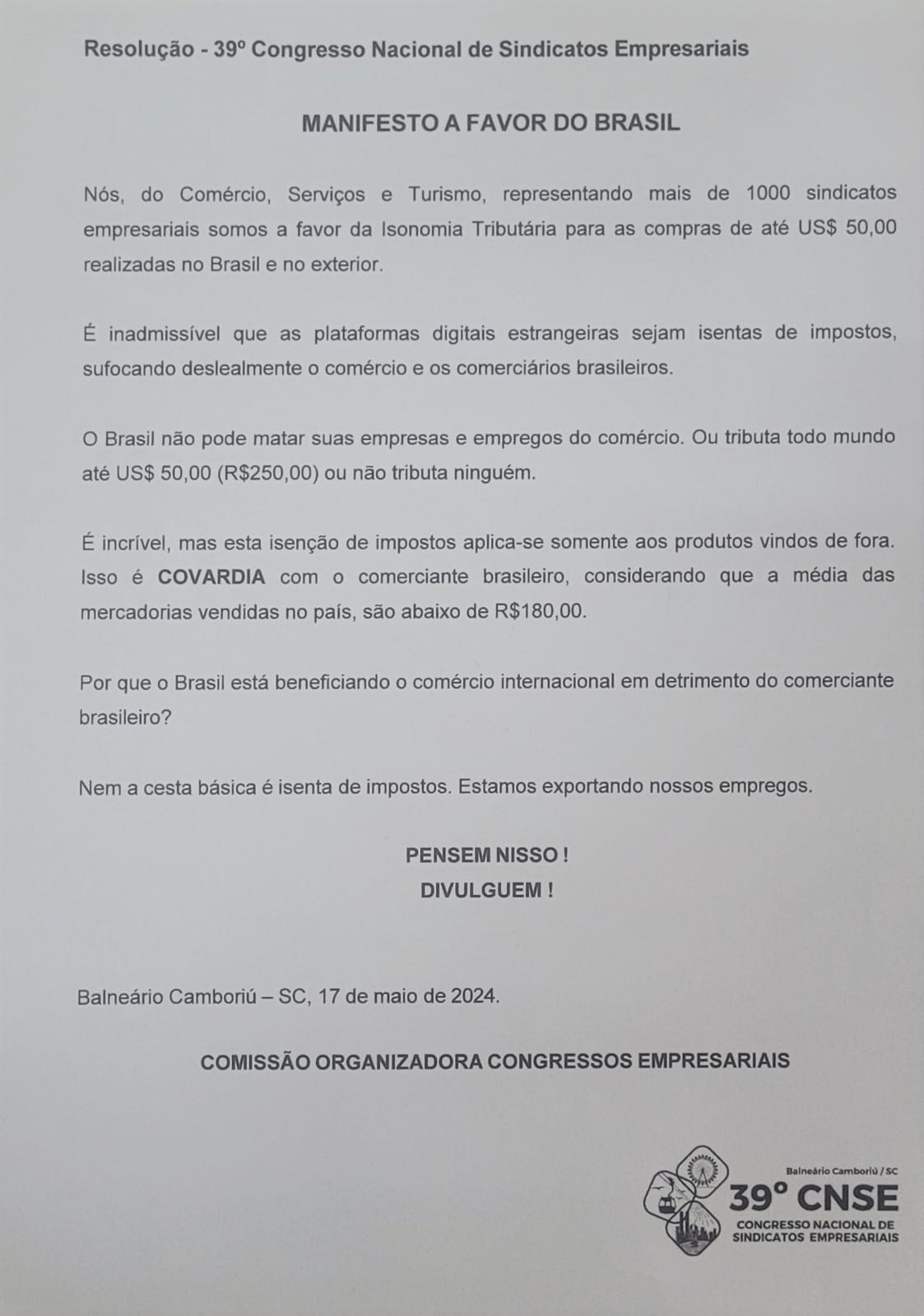 No encerramento do 39º Congresso Nacional de Sindicatos Empresariais do Comércio, realizado em Balneário Camboriú, SC, na semana passada, foi divulgado o Manifesto a Favor do Brasil, um libelo pela isonomia do comércio nacional em relação às plataformas estrangeiras de vendas online. Eis a íntegra do manifesto: