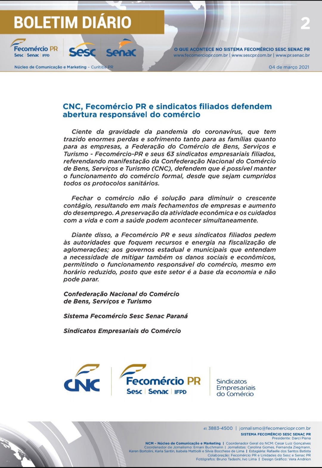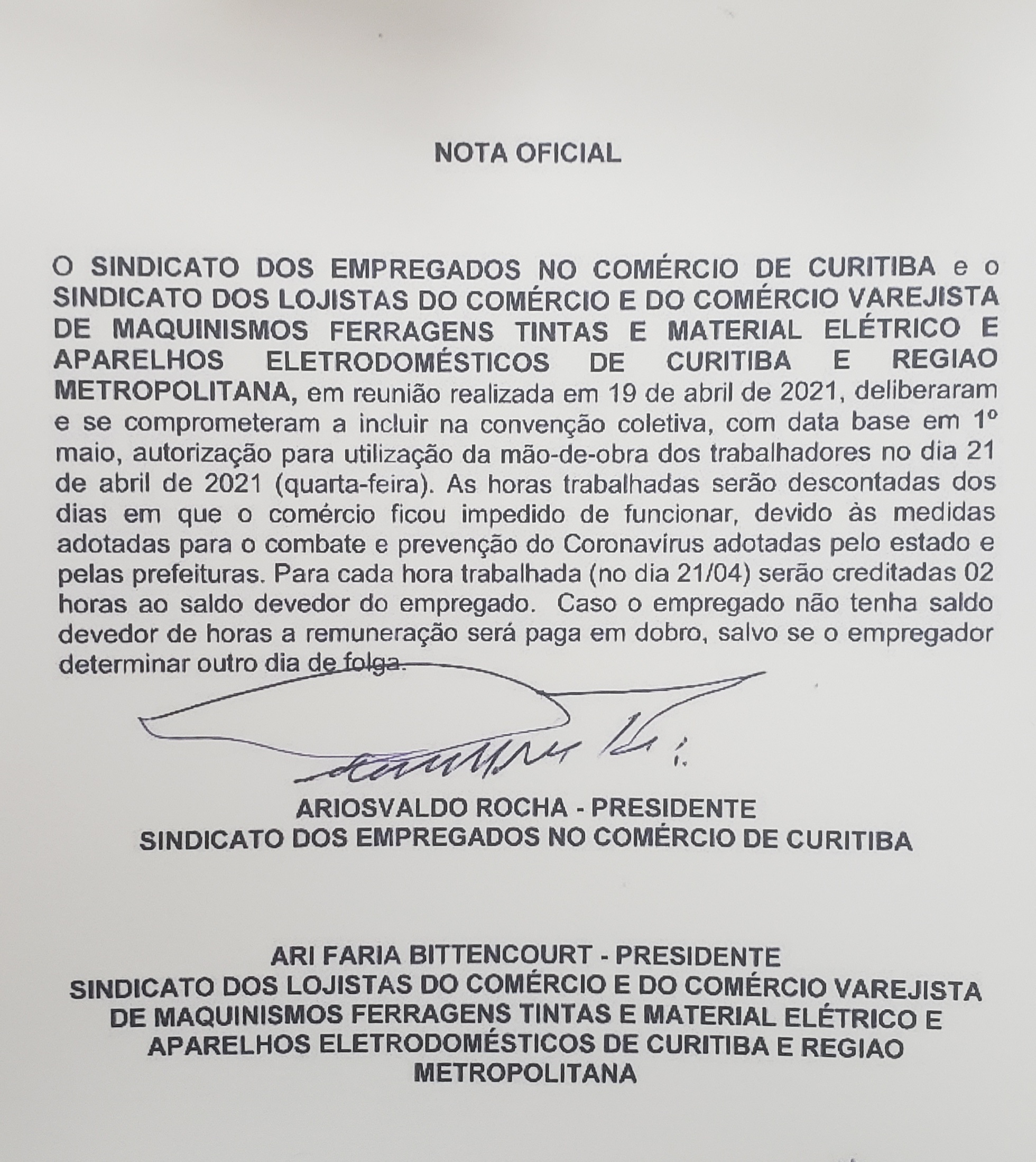 Sindicato dos Lojistas do Comércio e do Comércio Varejista de Maquinismos, Ferragens, Tintas, Material Elétrico e Aparelho Eletrodomésticos de Curitiba e Região Metropolitana.  SINDILOJAS CURITIBA negociou com o Sindicato dos Empregados no Comércio de Curitiba (Sindicom) a abertura do comércio na capital nesta quarta-feira (21), Dia de Tiradentes.