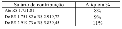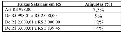 Atualmente são 3 alíquotas aplicadas de forma não cumulativa sobre o total da remuneração até o limite (teto) do salário-de-contribuição: